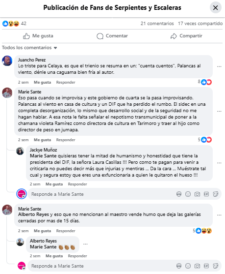 El texto de la columna -que para quien no conoce de cultura en Celaya lo denominaría "chisme"- constituyó quizá una de las primeras denuncias escritas, con tono crítico, hacia el manejo actual de la cultura en la administración pública de Celaya. (https://www.facebook.com/FansDeSerpientesYEscaleras/posts/pfbid035MsNsbH4t5ktdR5HHMuk4TNH2G6obrhuZdbXtVHmb7gmEZjy2jreToEgywfPYD2Pl )